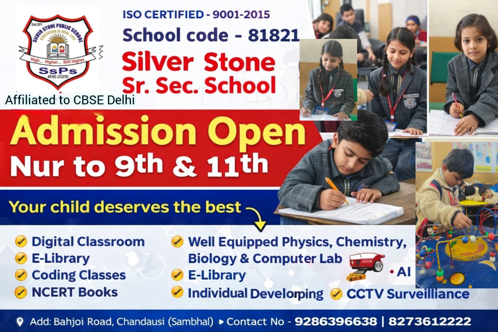 Silver Stone Sr. Sec. School, is established by Silver Stone Seva Samiti, Bahjoi. School is like an oyster bed, creating an environment which nurtures the pearling every oyster. Each student has been gifted with a special pearl. It is the endeavor of the institution to make each pearl polished & glowing. The medium of institute is English. The institution owns a palatial & imposing building consisting of big, airy and fully A.C. & well furnished class-rooms equipped with all modern teaching aids.